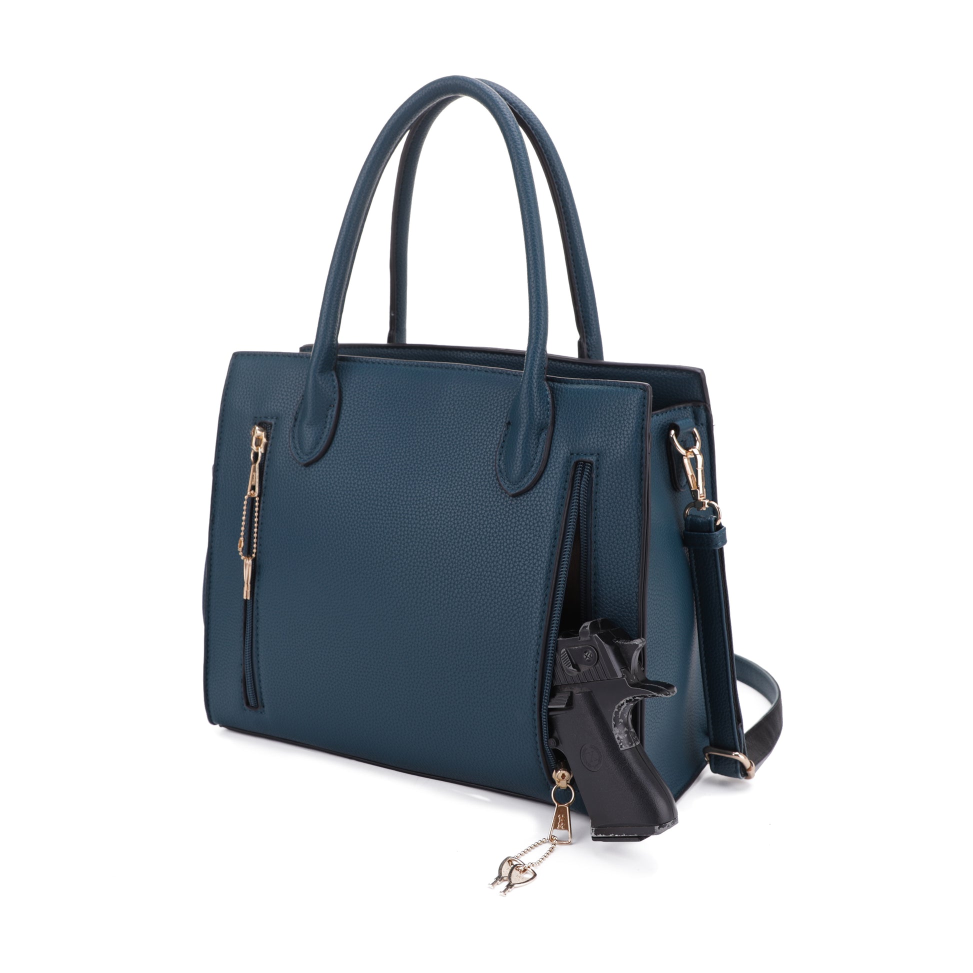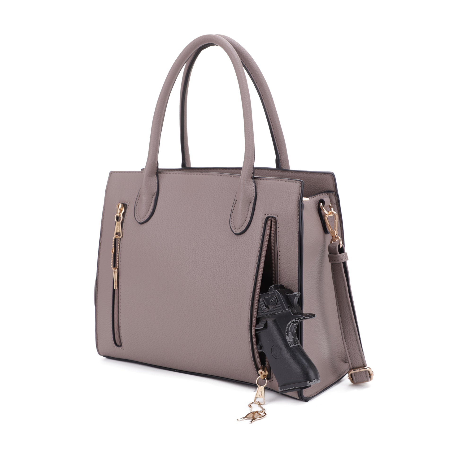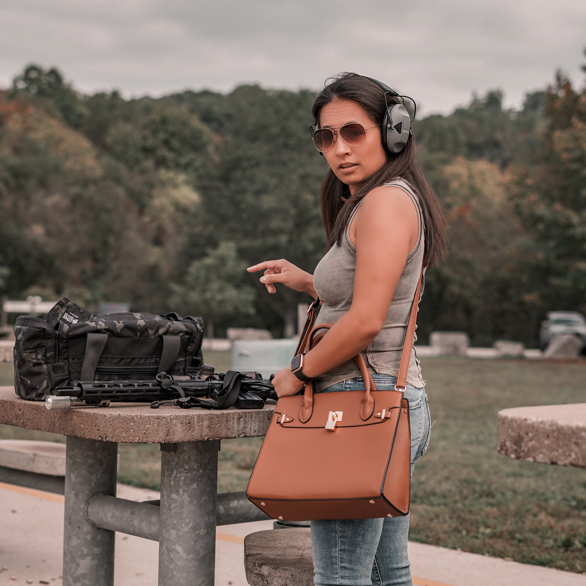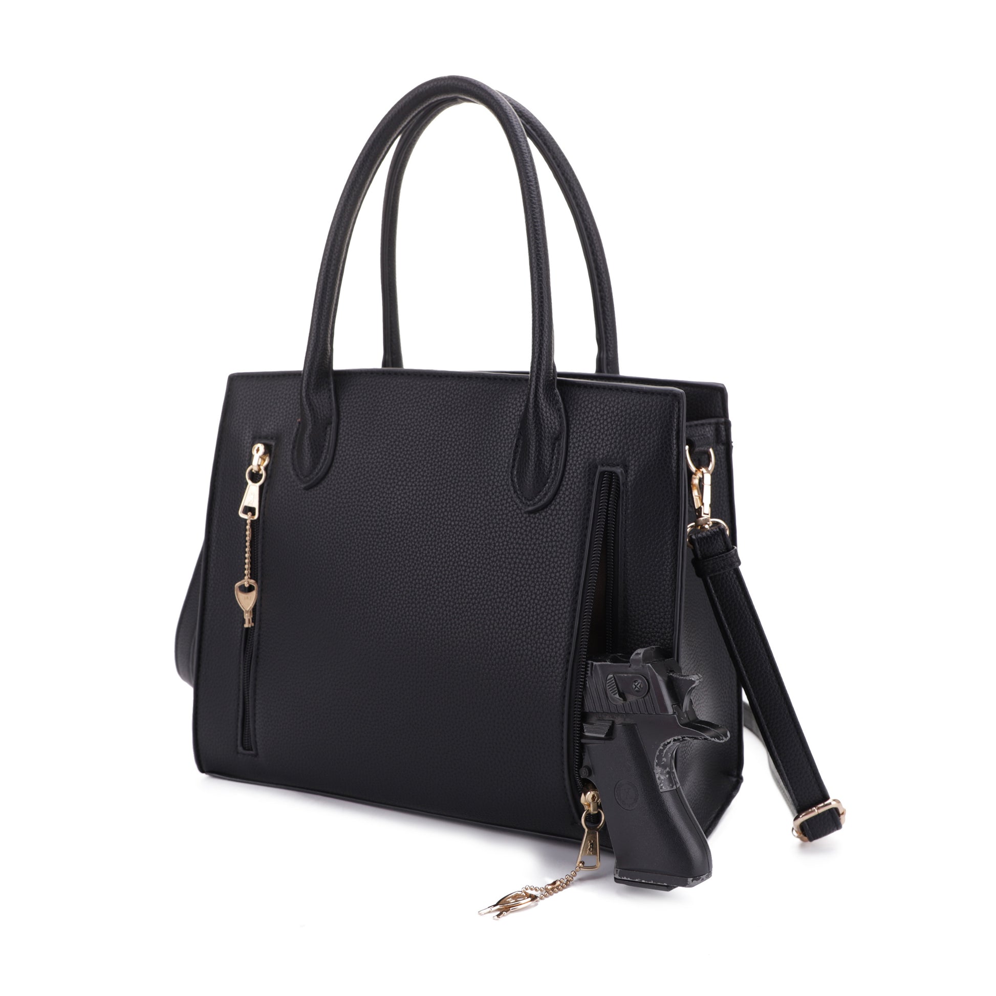 The Evelyn Concealed Carry Lock Satchel is a perfect way to conceal your weapon elegantly. This bag is great for everyday use and can hold everything you need comfortably.